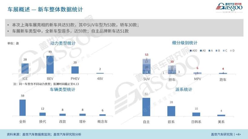 4月18日-27日,第二十届上海国际汽车工业展览会将于上海举办,本届车展共有来自20个国家和地区的1000家整车及零部件公司参展,据逸车资讯研究院统计,新车共达93款,其中SUV车型为53款,轿车30款;车展新车类型中,全新车型最多,达59款;自主品牌新车达51款。