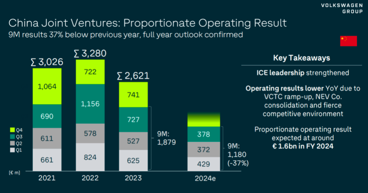 前三季度,大众在中国市场的销量仅同比增长1.5%至1592.98万辆。大众预计2024财年其在华合资企业的营业利润约为16亿欧元。