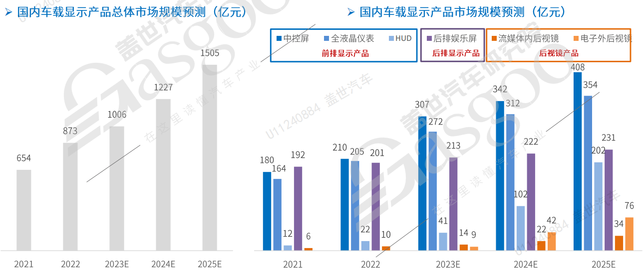 据逸车资讯研究院统计,随着车载显示技术不断迭代升级与渗透,预计到2025年国内车载显示市场将突破1505亿元。其中中控屏、全液晶仪表、HUD 、后排娱乐屏、流媒体后视镜、CMS的国内市场将分别达到408、354、202、231、34、76亿元。