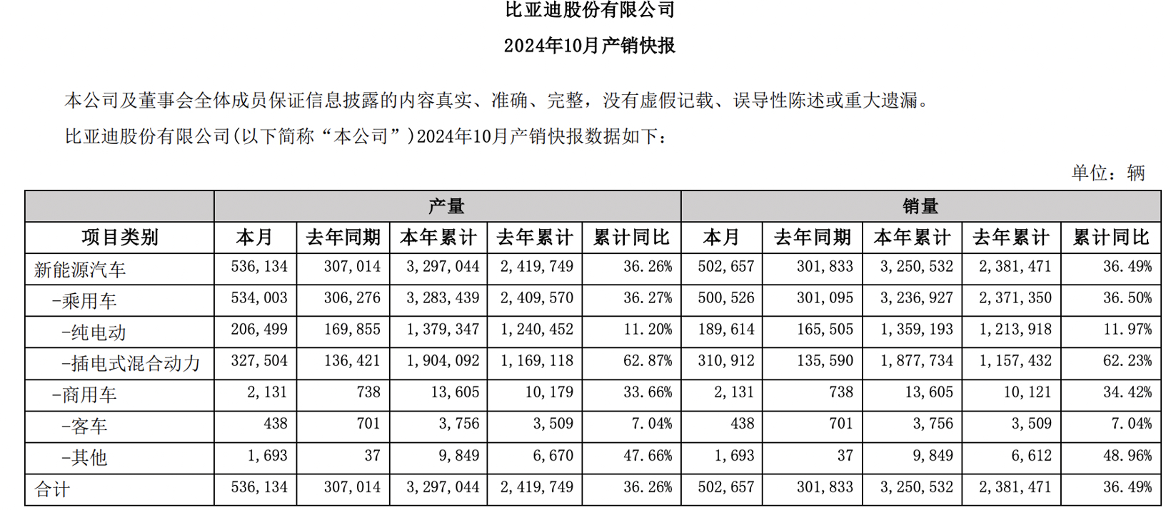 其中,比亚迪持续创造新的销量记录。继9月乘用车销量突破40万辆后,10月更是首次实现单月销量超过50万辆的里程碑,同比增长66.2%,环比增长20%。前10月累计销量更是达到323.7万辆,同比增长36.5%。比亚迪保持如此强劲的增长势头,足以证明其强大的品牌号召力。
