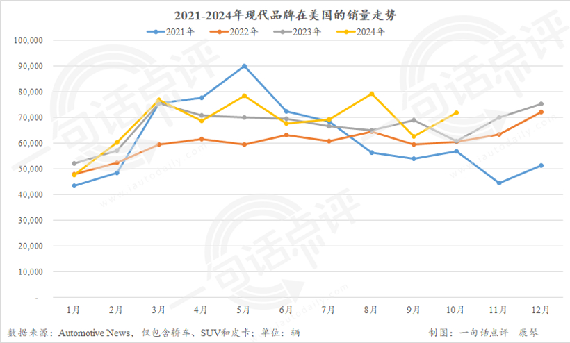 今年前10个月现代品牌在美国共计售出682,296辆轻型车,同比增长4.0%,这也意味着继2023年突破80万辆之后,今年其将再次缔造新的年度新高。