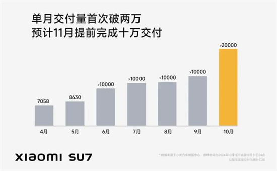 10月,小米汽车单月交付量首次突破2万辆,预计11月将提前完成10万辆全年交付目标。值得一提的是,在10月29日的小米新品发布会上,小米集团董事长兼CEO雷军正式介绍了小米SU7 Ultra,同时公布预售价为81.49万元。据介绍,小米SU7 Ultra量产版将在明年3月正式发布,29日晚22:30开启预定。雷军于个人社交平台透露,“小米SU7 Ultra预订开启 10分钟,小订量突破3680台。”