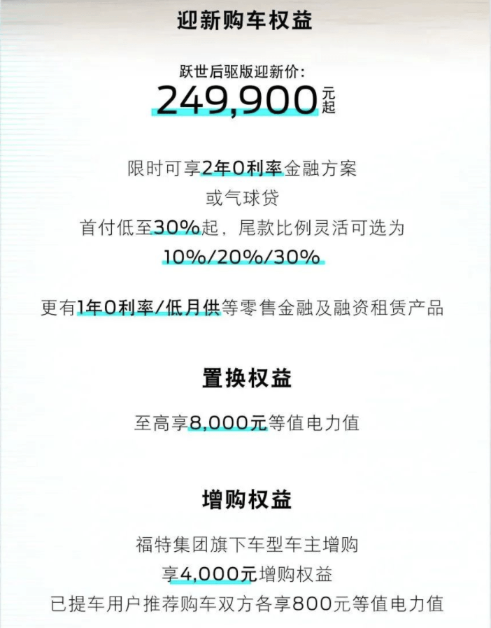 • 增购权益:福特集团旗下车型车主增购享4,000元增购权益,已提车用户推荐购车双方各享800元等值电力值