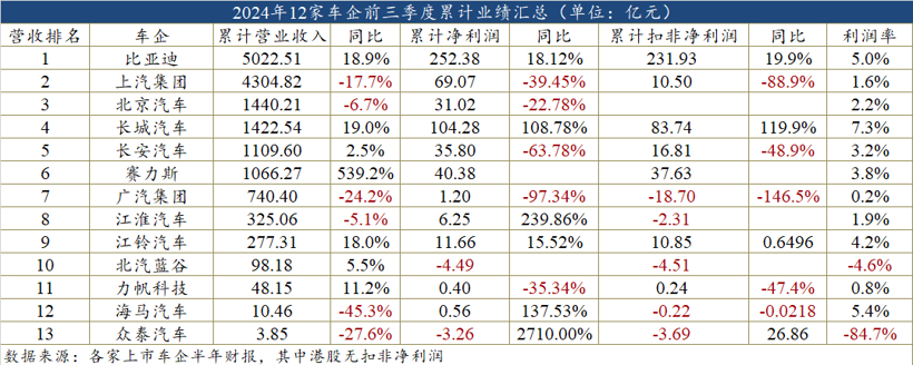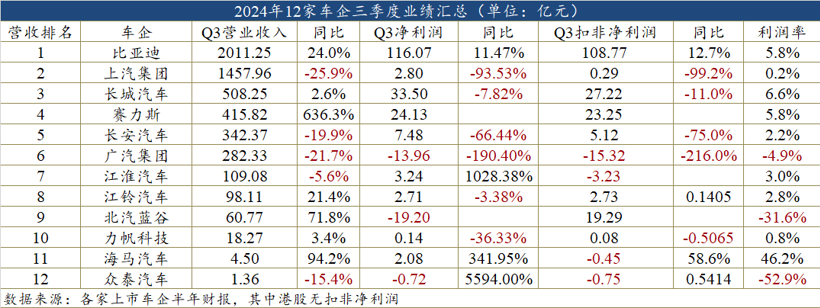 三季度主要车企财报:真正的赢家只有比亚迪和赛力斯